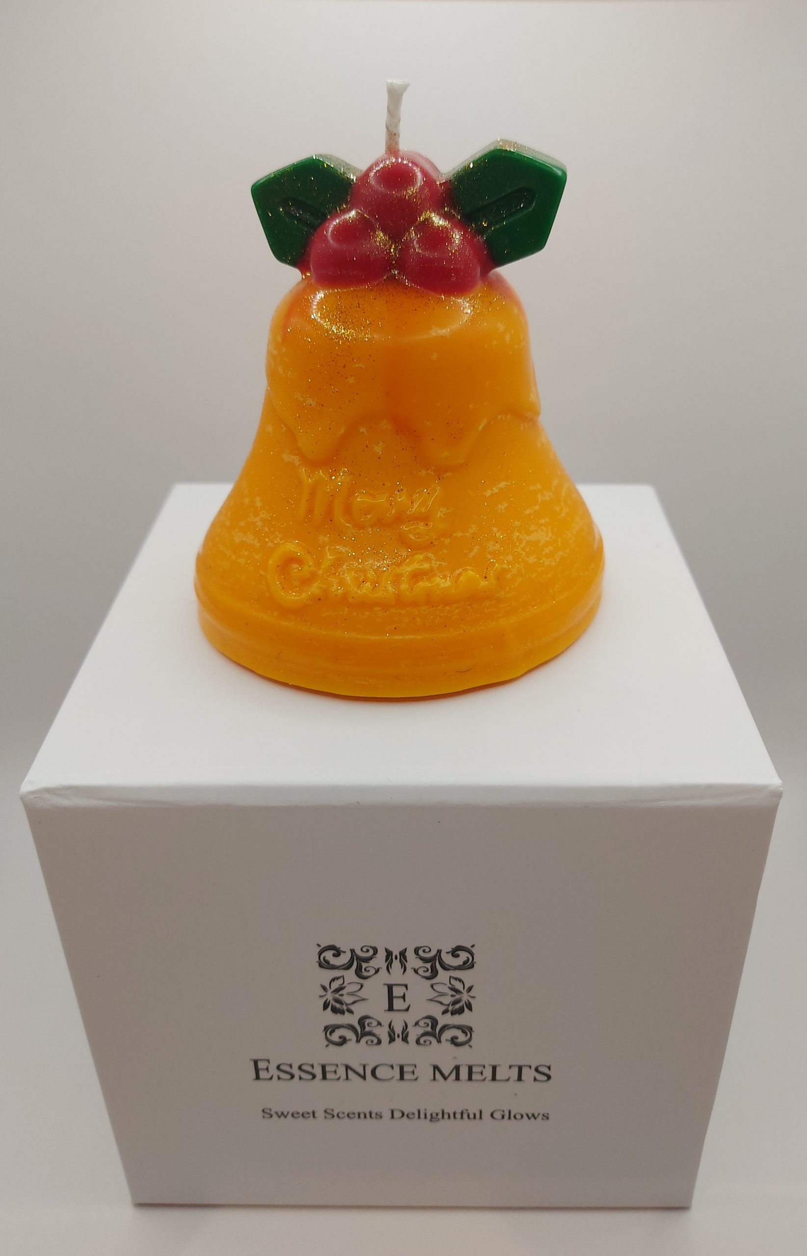 Shaped like a golden bell and finished in a warm yellow tone, this candle immediately evokes the joy and nostalgia of the season. The front is embossed with “Merry Christmas,” adding a sweet, heartfelt touch. To complete the design, two green holly leaves and three bright red berries sit atop the bell, creating a festive scene that feels both classic and cheerful.