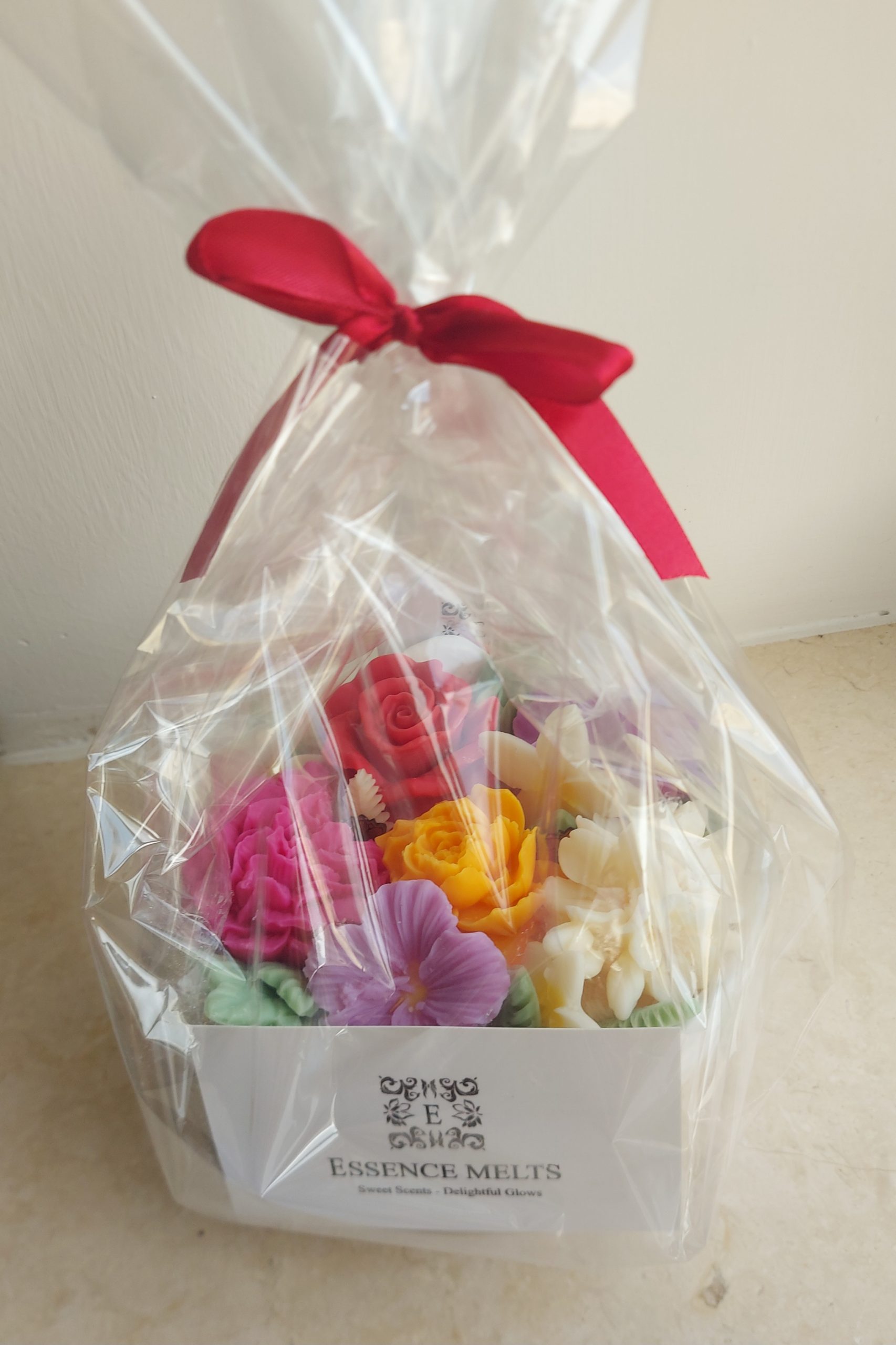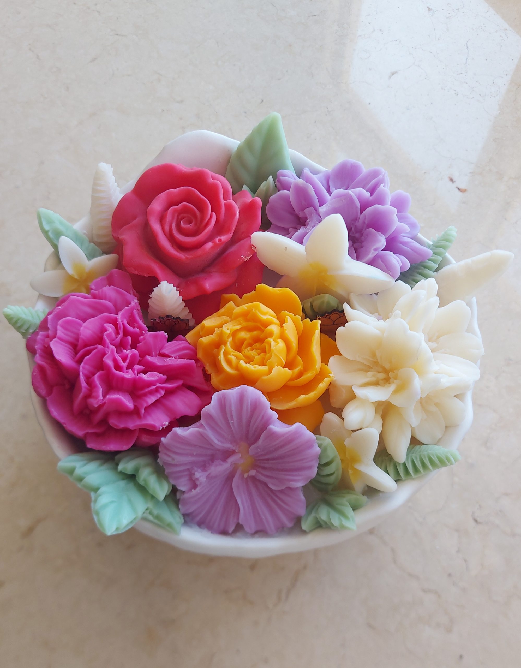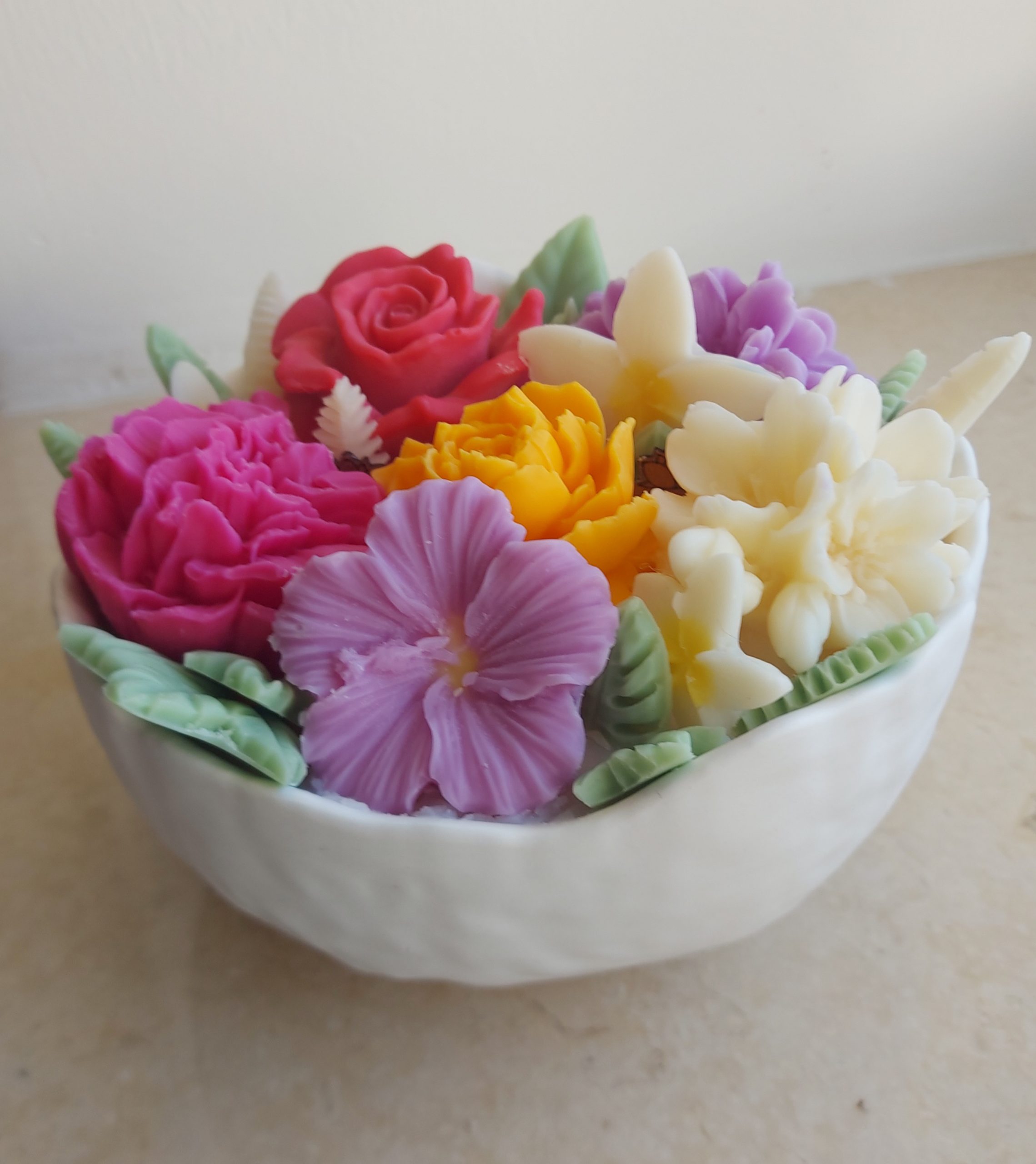Intricate, hand-sculpted wax flowers in rich colors — deep red, fuchsia, golden yellow, lilac, and ivory — decorate the surface. Soft green wax leaves surround the bouquet, creating the look of a freshly arranged floral centerpiece. Each candle is made with care and crafted to be one-of-a-kind.