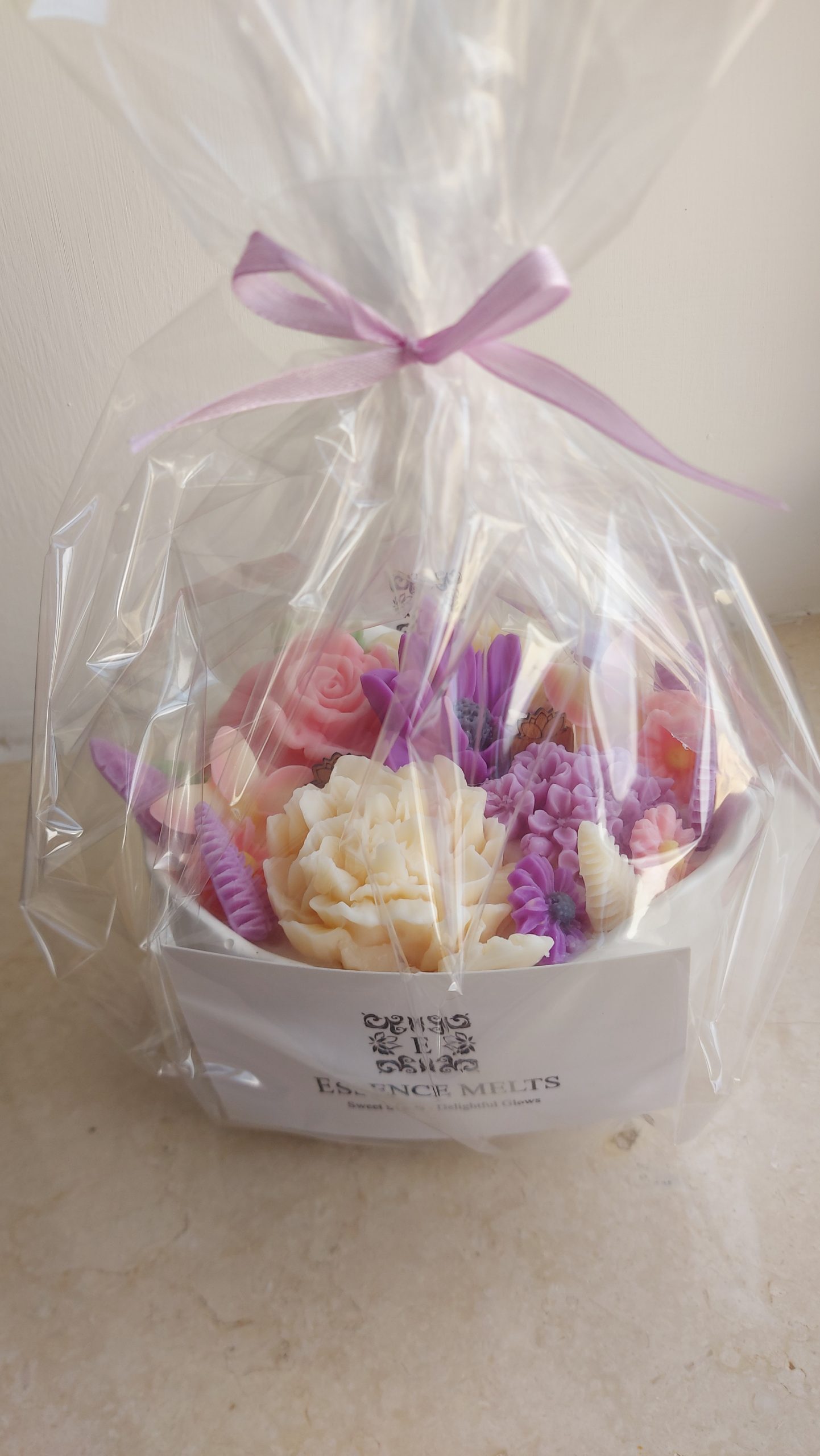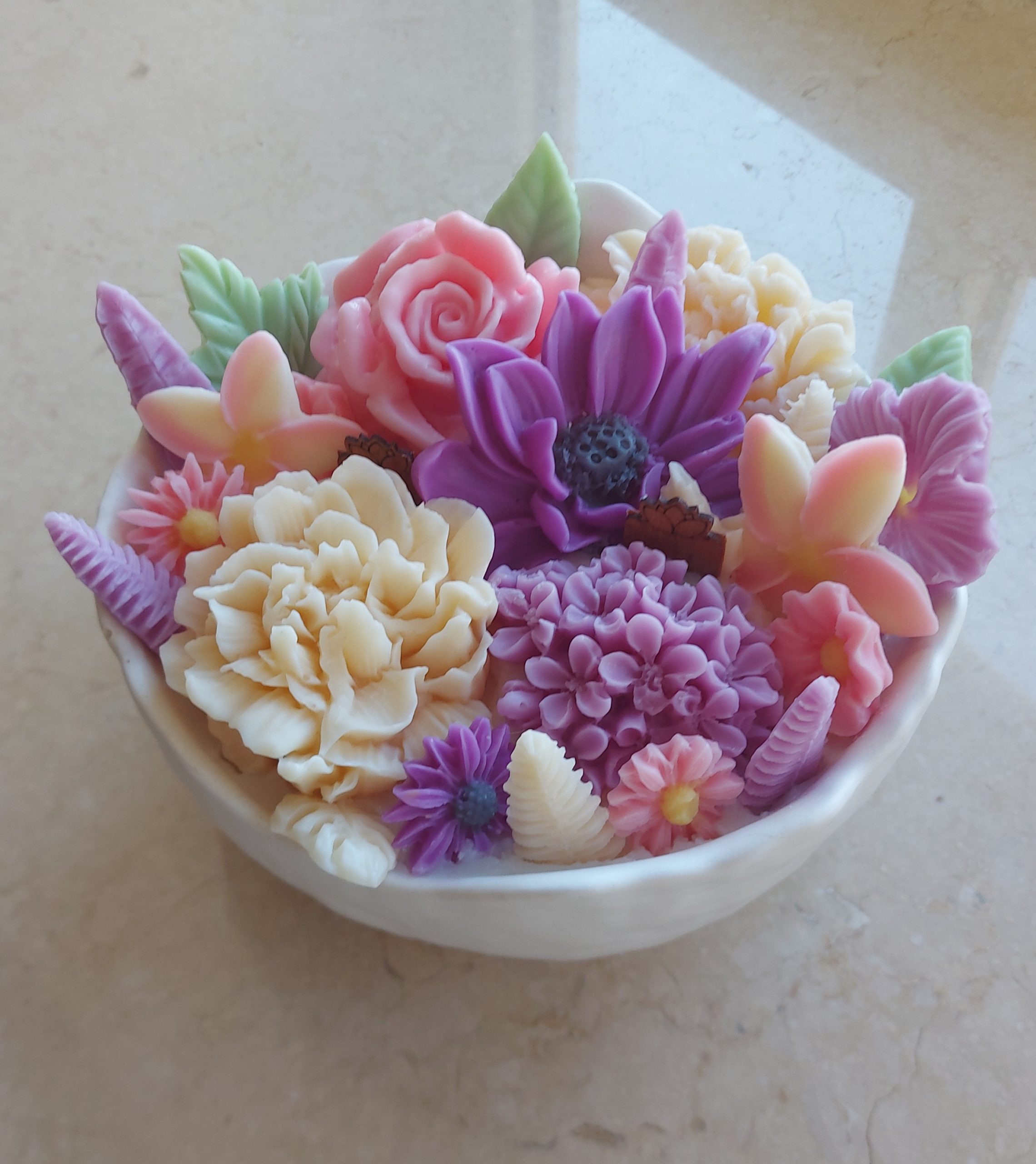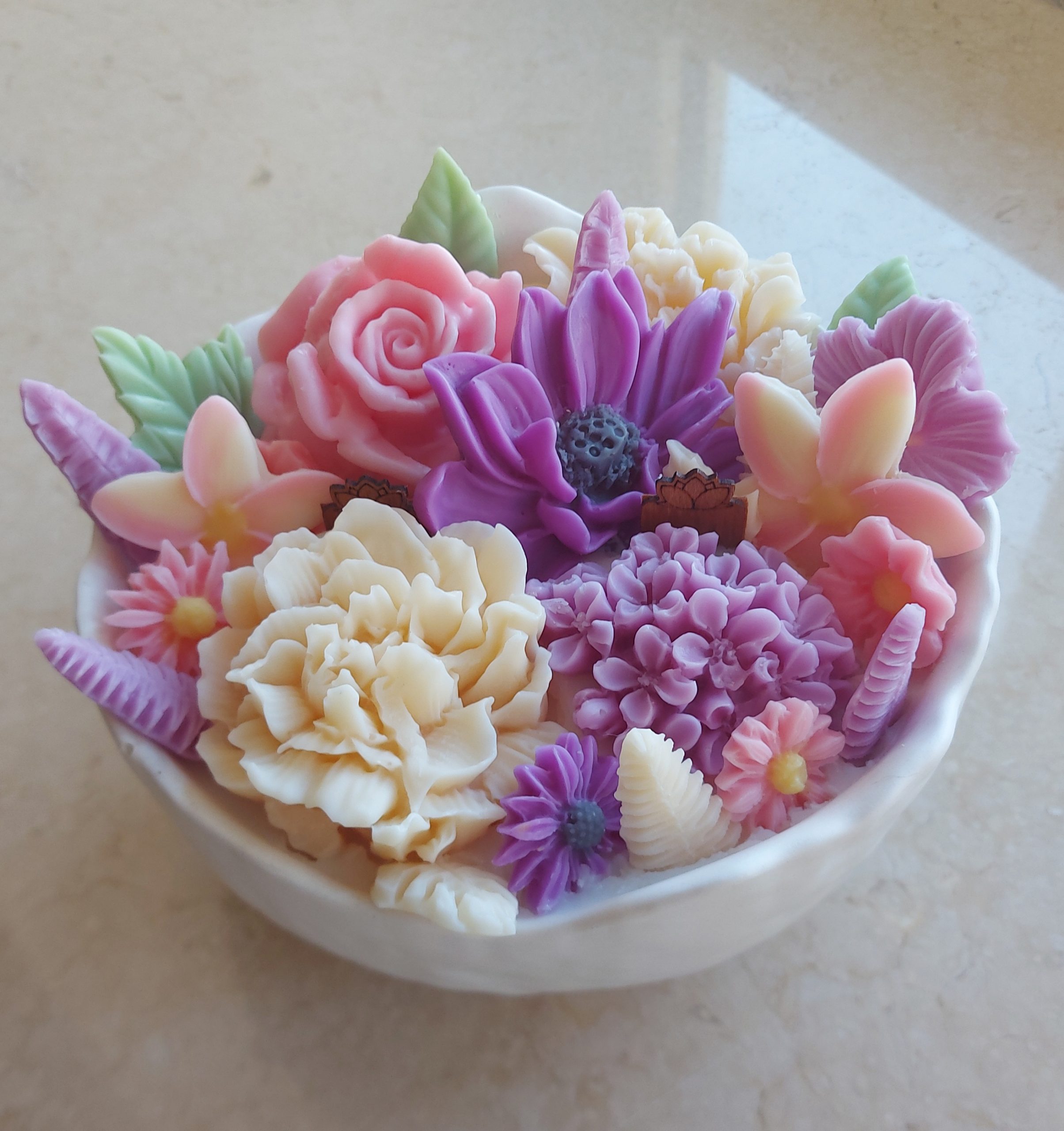 Its surface features beautifully sculpted wax flowers, arranged by hand in pastel shades. The visual effect is both elegant and calming, making it a standout décor piece for any room. Whether placed on a bathroom shelf, bedside table, or coffee corner, it instantly adds a touch of serenity.